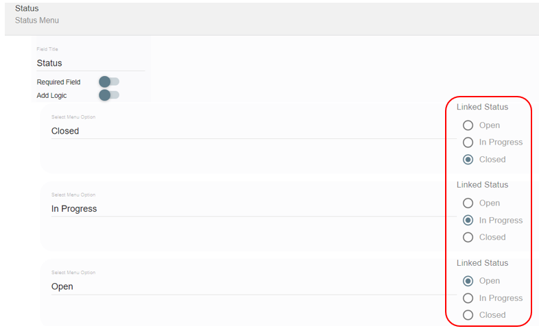 *NOTE: If one of the form fields is the 'Status', the menu's linked status must be selected before saving and closing the form.