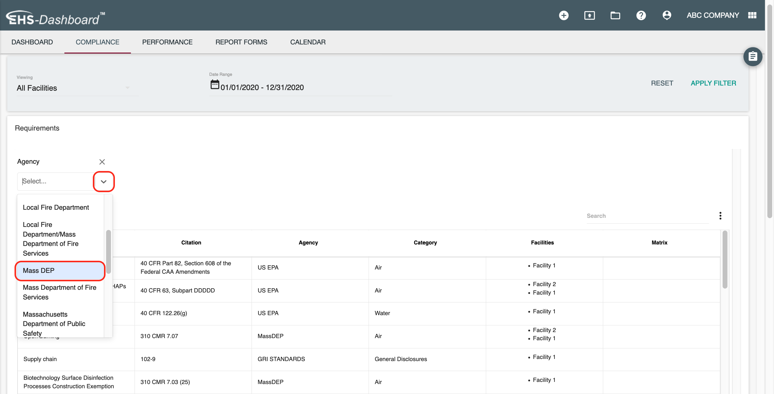 3. Using "Agency" as an example, click the arrow to present the dropdown menu and filter to Mass DEP: