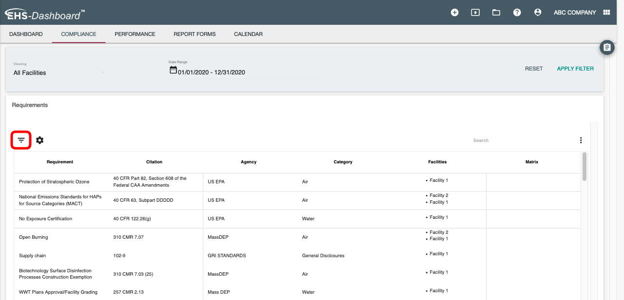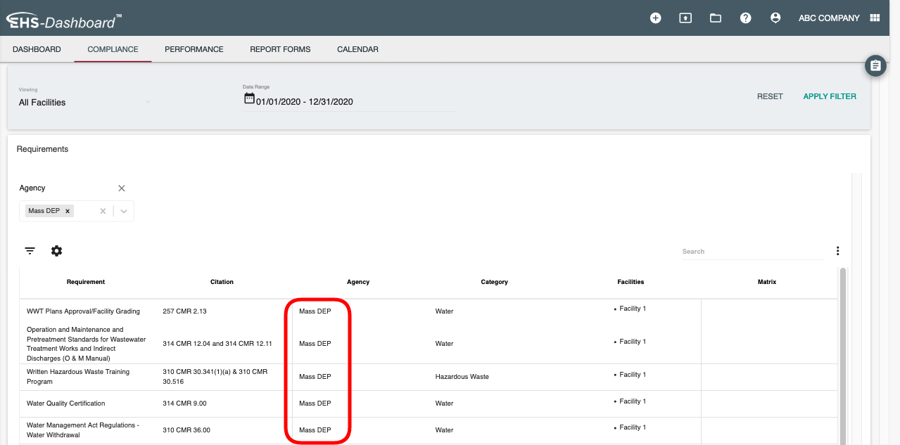 4. This will filter your table to only show requirements that involve Mass DEP: