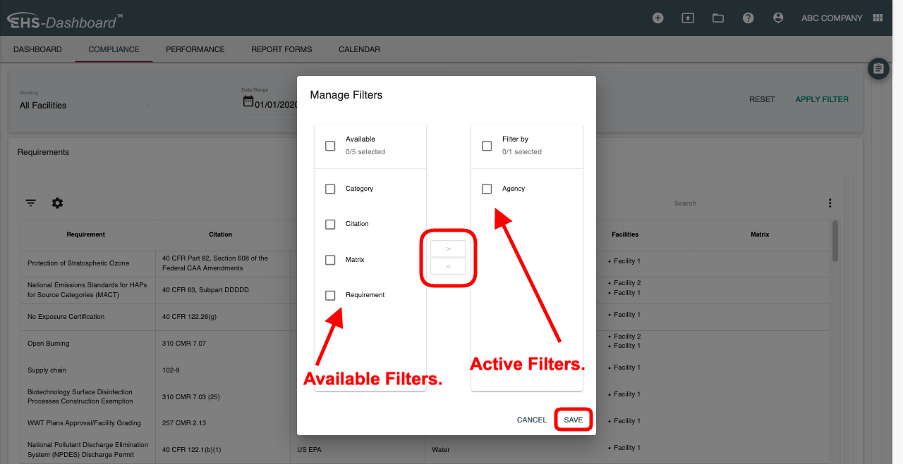 2. The manage filter controls will allow you to filter your data in the available columns. Make sure to click "Save" before exiting the manage filters modal: