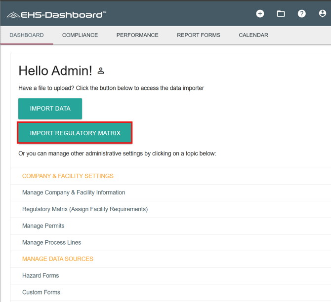 Before setting up your Regulatory Matrix in the EHS-Dashboard, you must complete the compliance groundwork to identify all applicable requirements and determine their relevance to your organization or sites. Once this work is complete, you can then configure your regulatory matrix in the EHS-Dashboard to track compliance for each requirement.