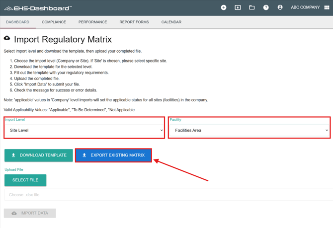 You will now be viewing the Regulatory Matrix for the selected facility.